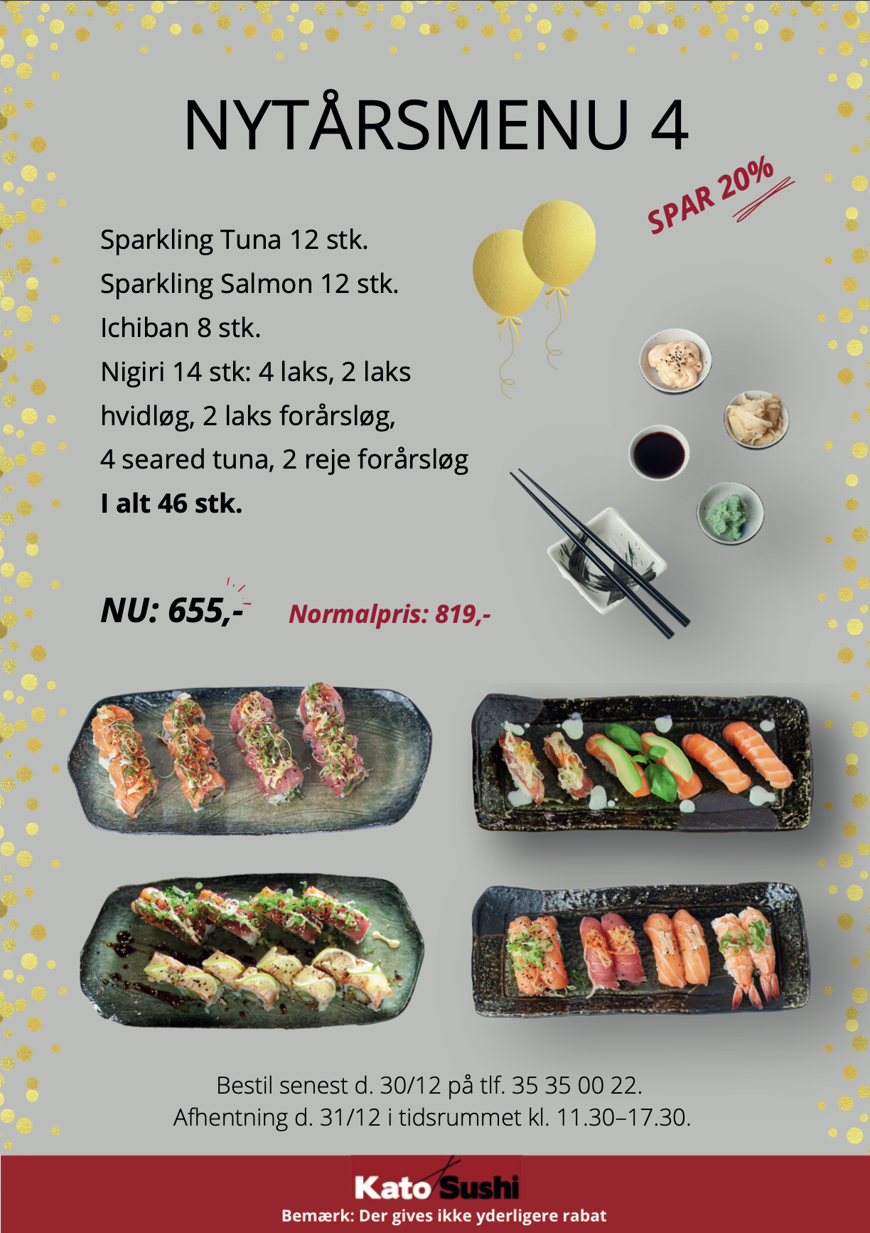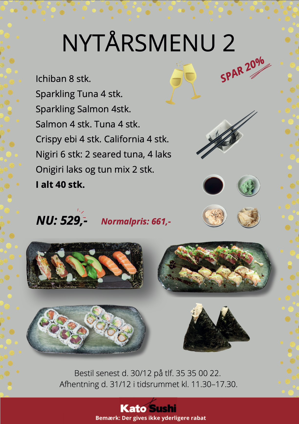 – Det er muligt at bestille næsten alle vores lækkerier fra menukortet, men der gives IKKE rabat på dette nytårsaften/dag. Dog kan man IKKE bestille vores varme retter den dag.
