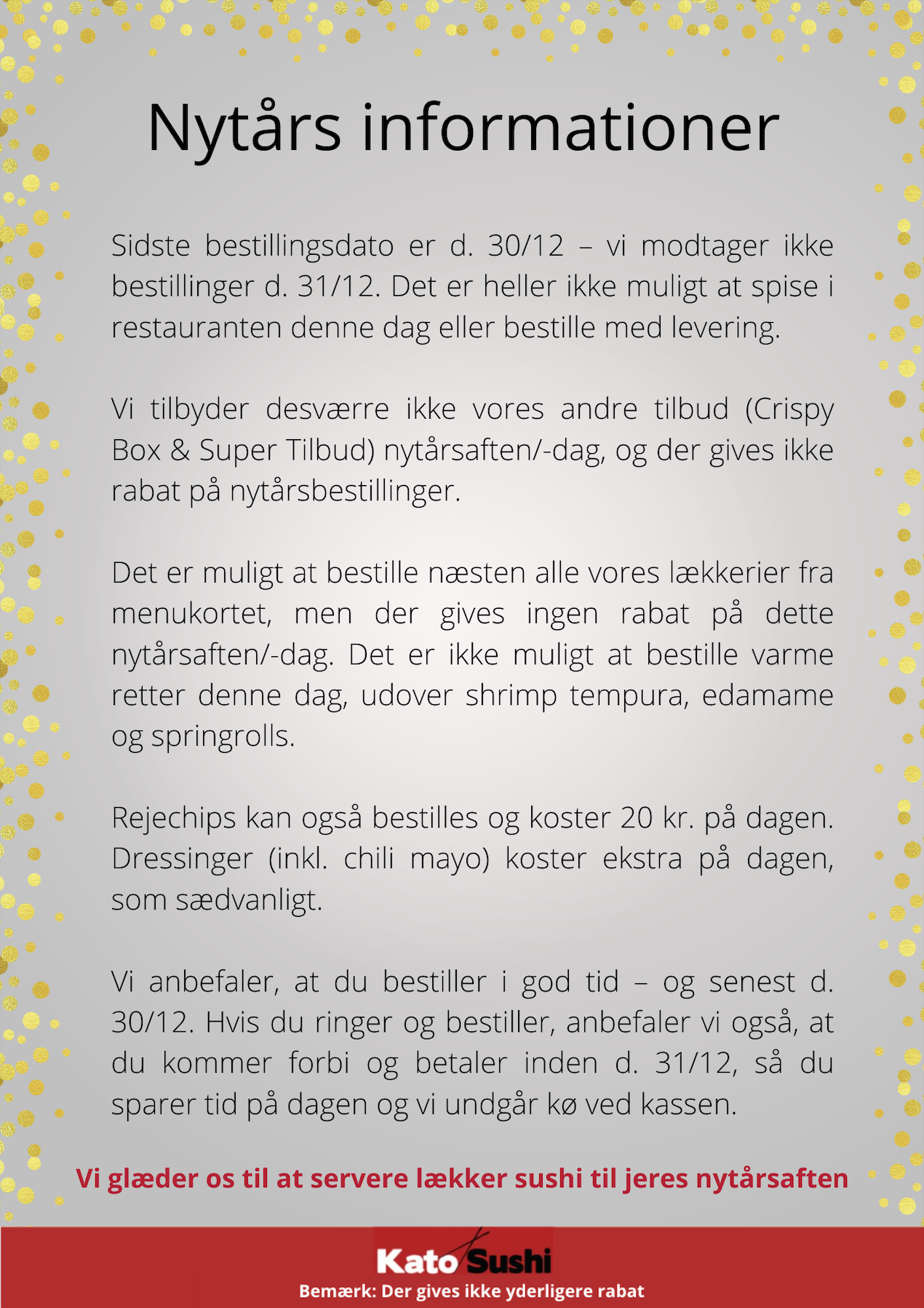 – Vi tilbyder desværre IKKE vores andre tilbud (Crispy Box & Super Tilbud) nytårsaften/dag.
